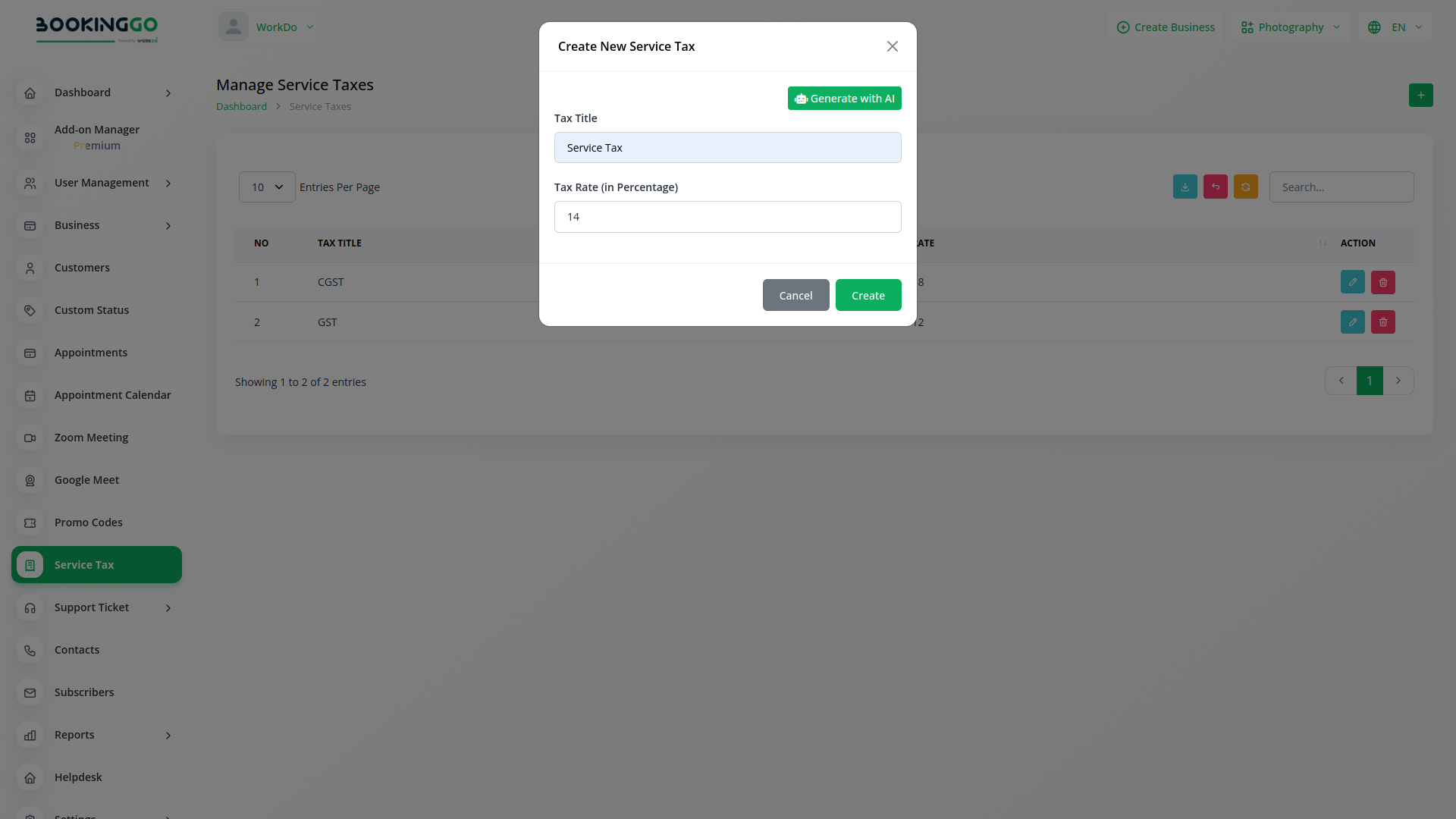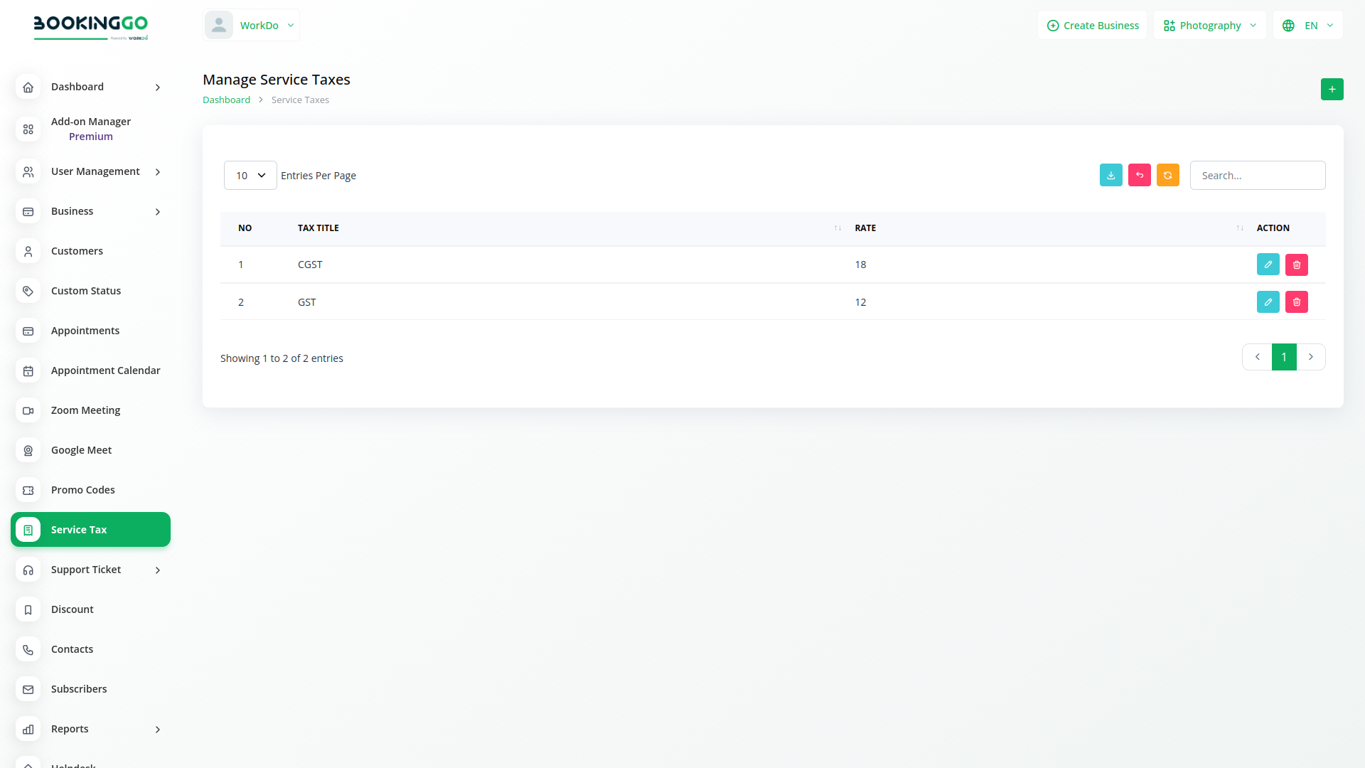 Efficiently manage your service tax requirements with the BookingGo SaaS Service Tax Module. Designed to simplify tax compliance for service-based businesses, our module offers comprehensive features to streamline tax calculations, reporting, and filing processes.
