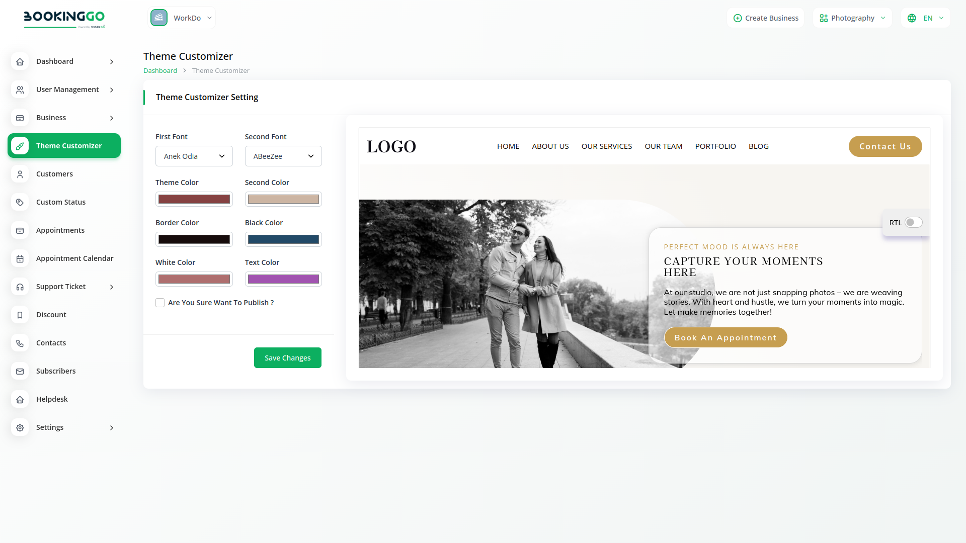 At BookingGo, we understand that every business is different. That’s why our theme library provides a wide variety of industry-specific designs, each crafted with functionality and style in mind. These themes are ready to use and offer flexibility to suit various purposes. You can easily browse the available options, select the one that resonates with your brand, and customize it to make it uniquely yours.
