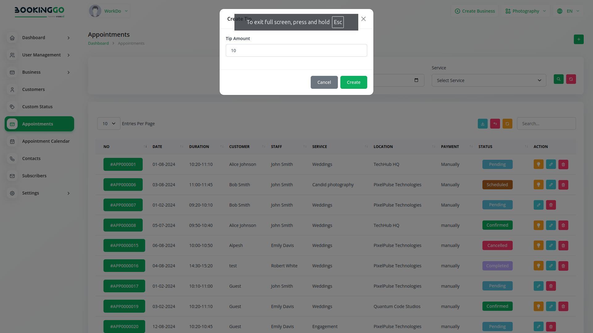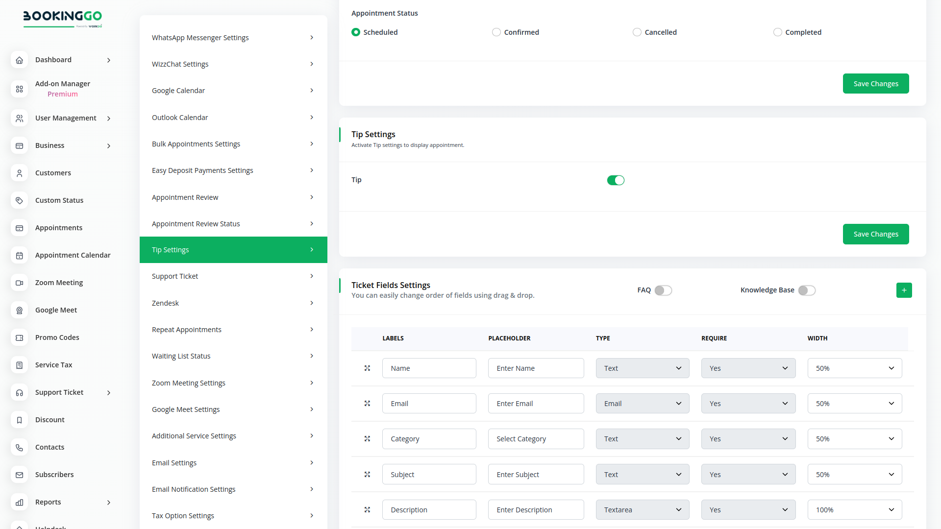 The Tip Module in BookingGo SaaS is designed for effortless integration with your appointment bookings. This intuitive feature ensures that adding a tip is a natural part of the booking process, making it easy for customers to reward exceptional service. By incorporating tipping directly into the appointment workflow, the module simplifies the transaction and enhances the overall user experience.